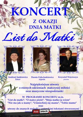 Wzruszający koncert zatytułowany "List do matki" zawiera najbardziej znane utwory o matczynej miłości i o znaczeniu Matek w naszym życiu. W znakomitym wykonaniu uznanych i utytułowanych artystów usłyszą Państwo m.in.: